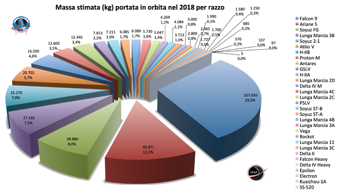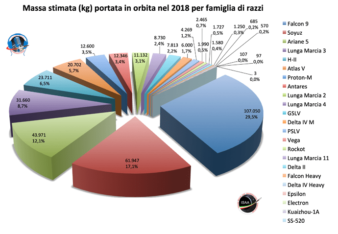 Per quanto riguarda i vari razzi, c’è stato il dominio del Falcon 9 che da solo ha contribuito per il 30% della massa totale. In pratica il doppio di tutti i razzi cinesi messi assieme. Anche qui, il primo razzo cinese (Lunga Marcia 3B) non entra fra i primi tre superato oltre che dal Falcon 9 anche da Ariane 5 (12% della massa totale) e Soyuz FG (8%).