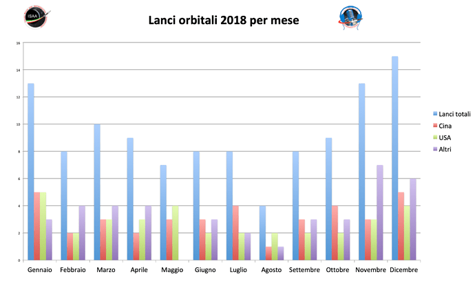 Il 2018 ha visto quindi 112 lanci orbitali non proprio equamente ripartiti fra i 12 mesi. In agosto (buon per noi che eravamo in vacanza!) ci sono stati solo 4 lanci mentre l’anno, che era iniziato col botto grazie ai 13 lanci di gennaio, si è chiuso con il super-botto grazie ai 13 lanci di novembre e ai 15 di dicembre. Cina e USA l’hanno fatta da padrone, con la prima che ha saputo effettuare ben 5 lanci sia in gennaio che in dicembre mentre i secondi “solo” in gennaio, ma gli USA hanno effettuato almeno due lanci in ogni mese di calendario mentre la Cina in agosto ne ha effettuato uno solo. In maggio Cina e USA si sono spartiti tutti i lanci effettuati in quel mese, mentre in novembre ci sono stati ben sette lanci effettuati da altre nazioni.