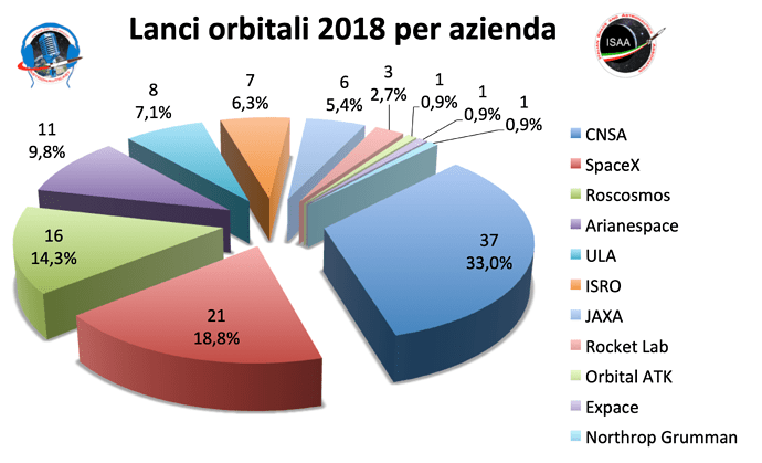 L’agenzia spaziale cinese (CNSA) ha effettuato 37 dei 38 lanci cinesi dominando di conseguenza la classifica riservata alle “aziende”, intese come agenzie spaziali od organizzazioni governative e private. Completano il podio SpaceX con 21 lanci e Roscosmos con 16. Fanalini di coda Orbital ATK, Expace e Northrop Grumman con un lancio a testa.