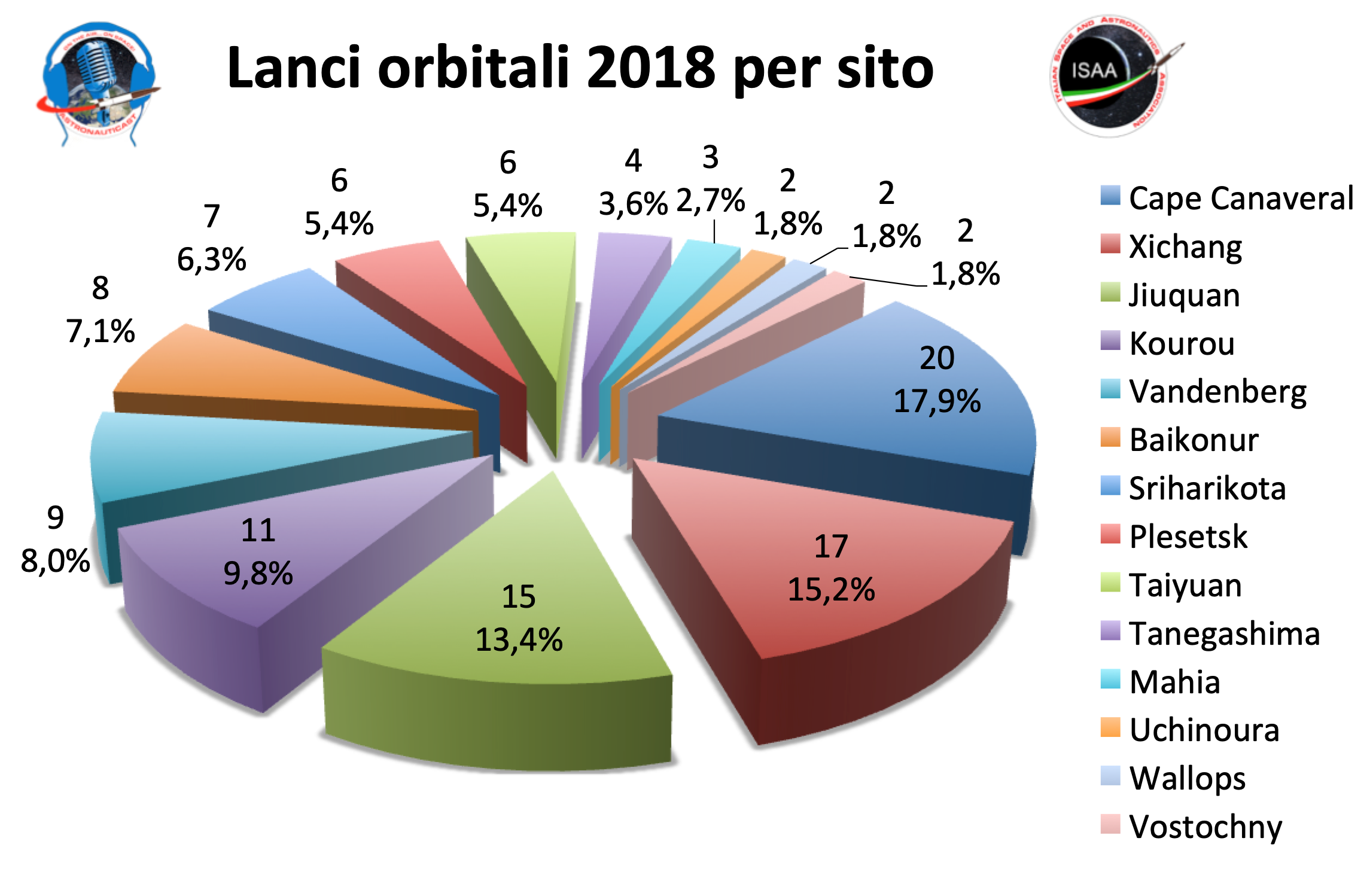 I 112 lanci sono avvenuti da 14 diverse località, capitanate dall’americana Cape Canaveral con 20 lanci alla quale seguono le cinesi Xichang e Jiuquan con rispettivamente 17 e 15 lanci.