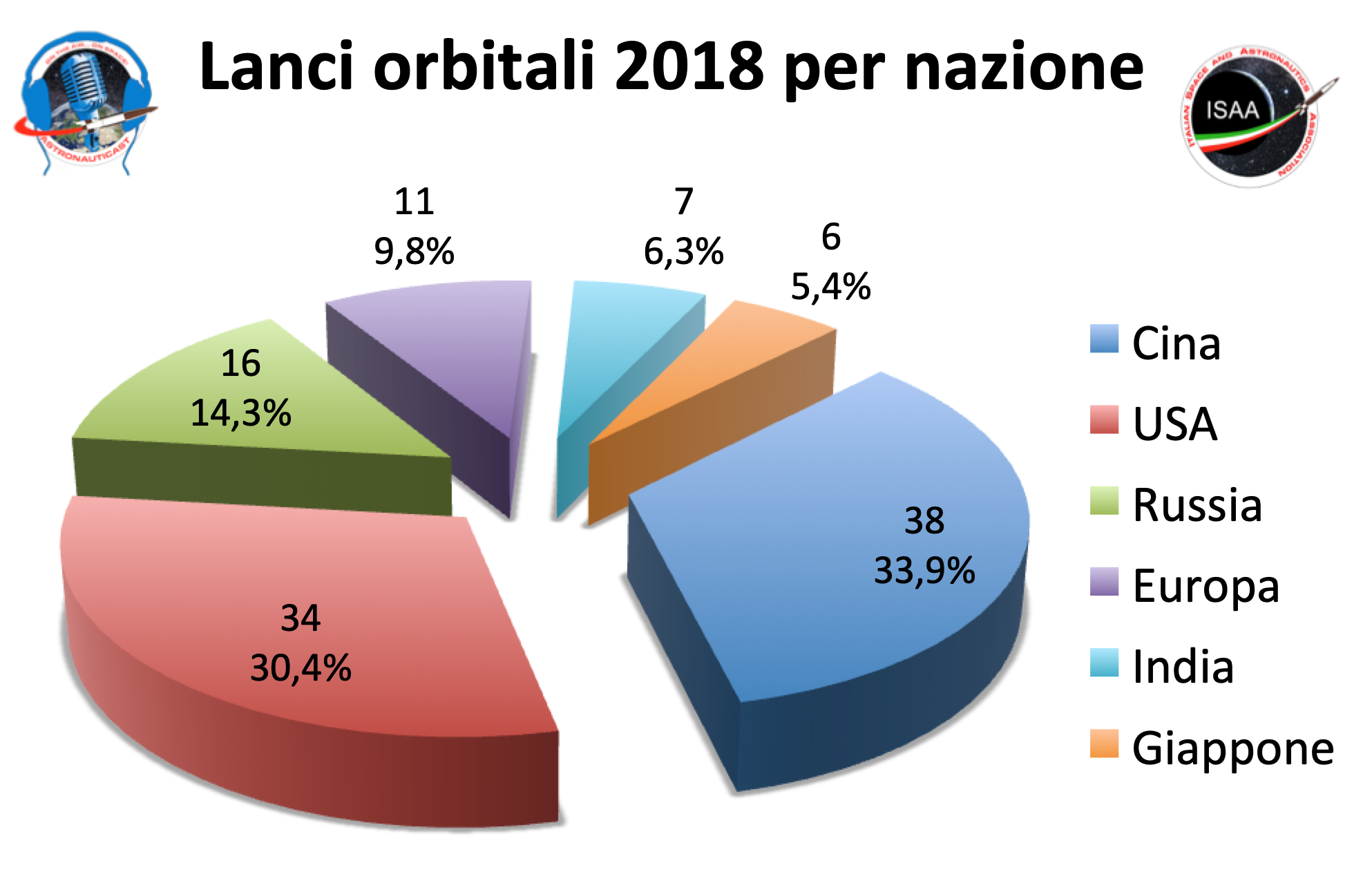 Alla fine l’anno si è chiuso con 38 lanci da parte della Cina e 34 da parte americana, mentre tutte le altre “nazioni” (l’Europa agisce come un’entità unica) messe assieme ne hanno effettuati 40, con il Giappone fanalino di coda grazie a soli 6 lanci (in media uno ogni due mesi).