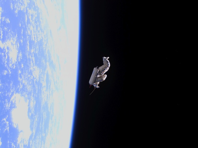 A Russian Orlan model spacesuit soars above the blue Earth. This particular spacesuit was no longer needed and so was filled up with batteries, internal sensors and a radio transmitter and released into a decaying orbit on Feb. 3, 2006. Designated SuitSat, the empty vessel burned up in the atmosphere a few weeks later.