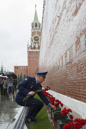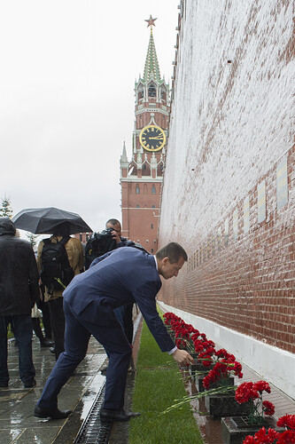 Dopodiché, nonostante la pioggia, sono stati sulla Piazza Rossa a deporre un fiore sulle tombe del primo cosmonauta e del “progettista capo”