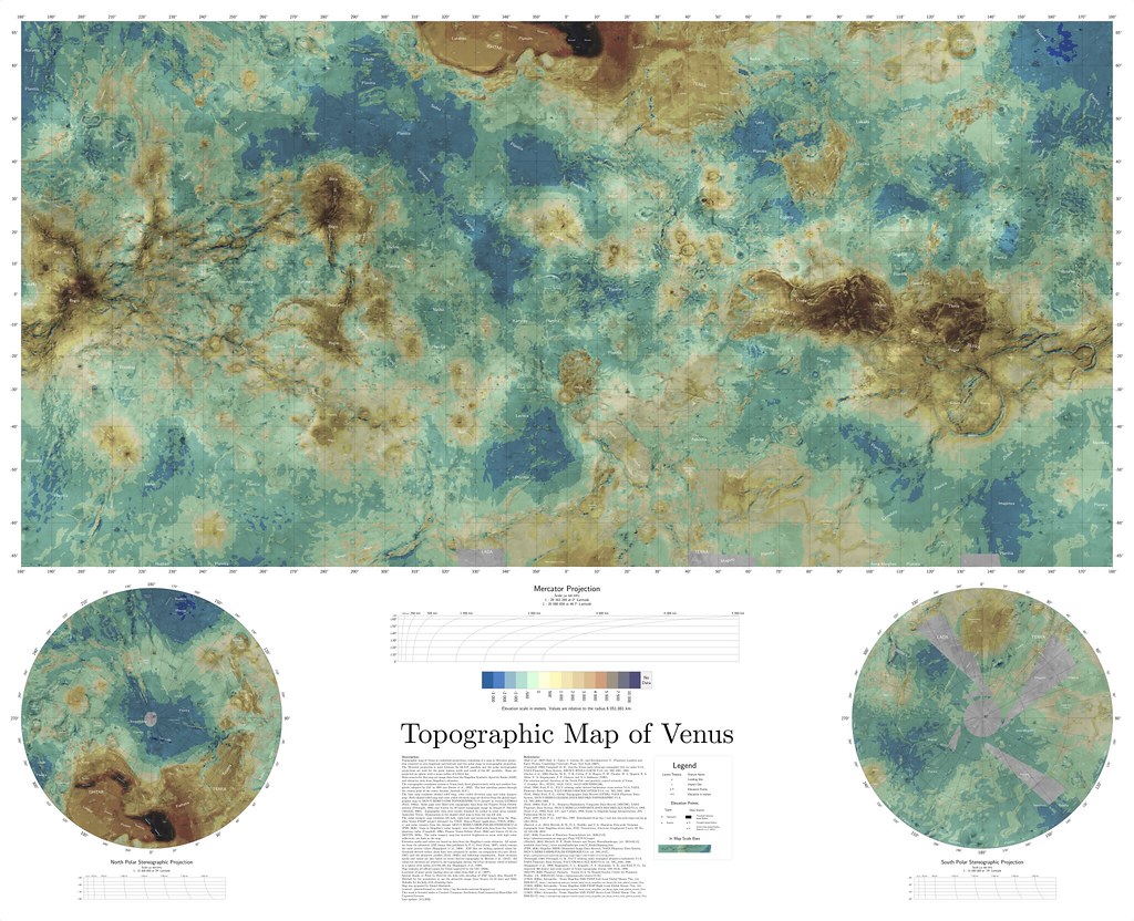 Topographic map of Venus in conformal projections, consisting of a map in Mercator projection centered on zero longitude and latitude and two polar maps in stereographic projection. The Mercator projection is used between the 66.513◦ parallels and the polar stereographic projections are used for the polar regions north and south of the 60◦ parallels. Maps are projected on sphere with a mean radius of 6 051.0 km. Main sources for this map are image data from the Magellan Synthetic Aperture Radar (SAR) and altimetry data from Magellan’s altimeter