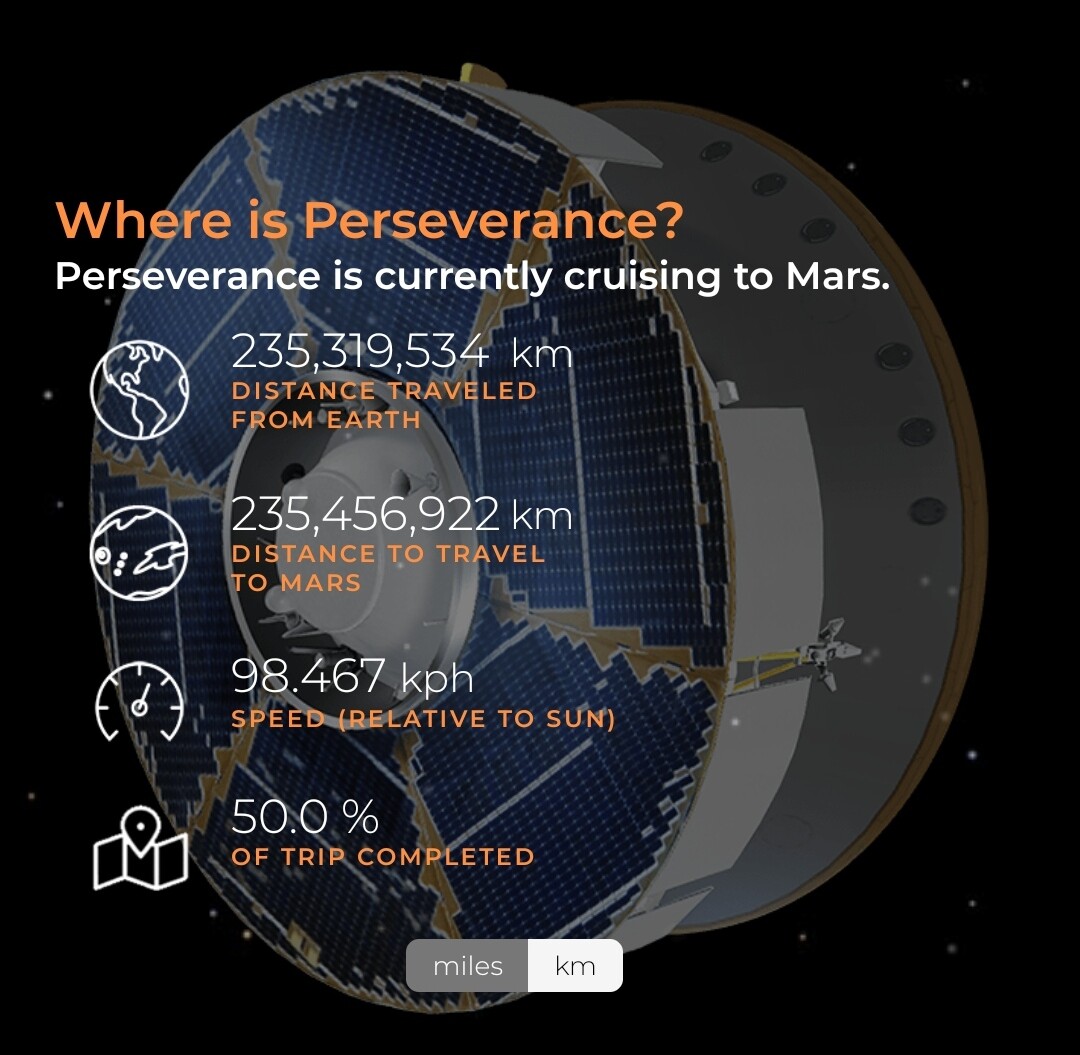 Intanto Perseverance è prossima ql giro di boa del suo viaggio verso Marte, a cui si sta avvicinando a quasi 28 km/s (velocità relativa rispetto al Sole).