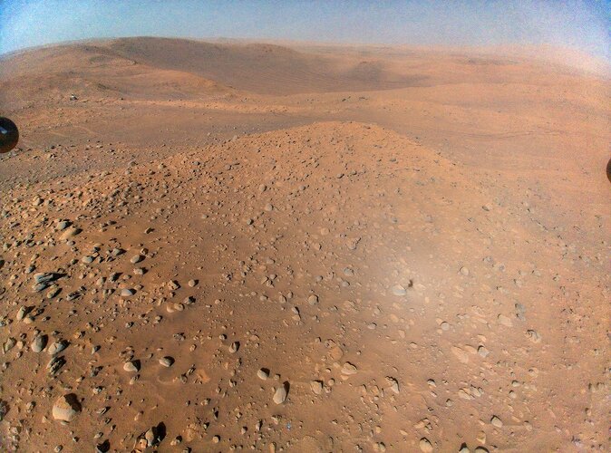 Per la prima volta in due anni Perseverance è abbastanza vicino ad Ingenuity per osservare la polvere sui rotori. La distanza in foto è di circa 23 metri.