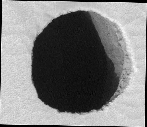 Vedo che la discussione su questi “buchi marziani” è un po’ spenta, qui… Peccato, a me la cosa entusiasma molto sin dalla prima fot, tant’e’ che ho scritto diverse pagine sull’argomento. Leggendole “a fila” vedrete come si sono evolute nel tempo le mie ipotesi, passando dal lago, al tunnel, alla caverna.