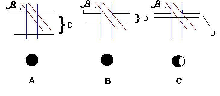 Nel caso A non posso determinare la profondità D, ma nel caso B si, perche’ conosco l’angolo Beta (altezza del sole sull’orizzonte) e la larghezza W del buco, quindi: