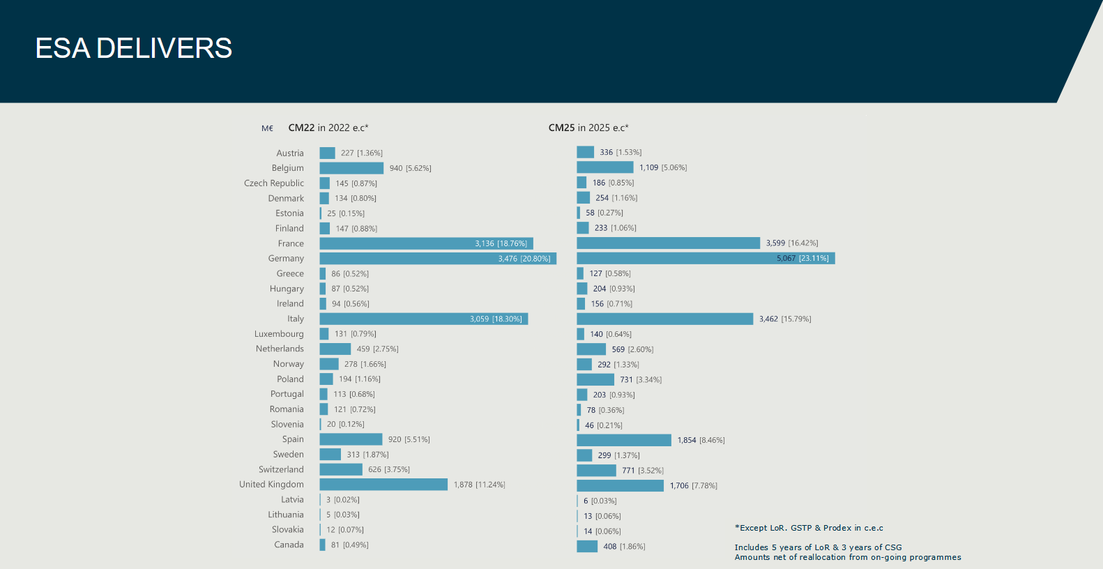 […] In addition to the Human and Robotic Exploration programme, the United Kingdom’s spending on ESA programmes saw a notable reduction, with the country now the fifth largest contributor, falling behind Spain, which recorded a substantial increase in its spending. While the United Kingdom’s total spending was reduced by just €172 million, from €1.878 billion to €1.706 billion, its contribution as a percentage of the total budget fell from 11.2% to 7.7%, the largest decline of any country by a considerable margin.