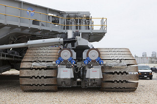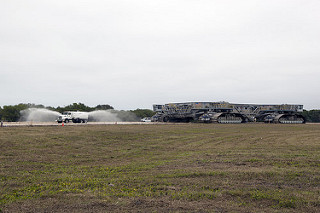 Se il fondo stradale è lo stesso del periodo del Saturno V in cima ai tre strati di vari riempimenti che costituiscono il fondo stradale (più di 200 cm di profondità) vi è una copertura di ciottoli di fiume profonda 20 cm sulle curve e 15 cm sul rettilineo. Questo strato riduce l’attrito durante la fase di sterzata e aiuta a distribuire il carico sugli appoggi del trasportatore. Anche se la velocità del Crawler Transporter è molto bassa (1,6 Km/h) i cingoli muovendosi su uno strato di questo tipo alzerebbero abbastanza polvere se non si usasse l’accorgimento di irrorare con acqua la crawlerway. Si IK1ODO lo fanno proprio per la polvere.