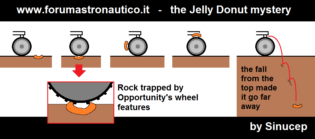 Secondo Steve Squyres, PI dei MER, intervistato al podcast Planetary Radio, l’ipotesi più probabile è che la roccia sia stata “scalciata” da un paio di metri più in la dove c’è un piccolo rilievo: il rover qualche giorno prima (subito dopo aver ripreso la prima immagine) era salita sul piccolo rilievo (credo di qualche decina di centimetri più in alto, non di più) e poi aveva “fatto inversione” come fanno i rover a 6 ruote: girando su se stesso. Siccome una delle ruote anteriori non gira più bene, ma viene trascinata da un po’, è probabile che questa abbia fatto rotolare il sasso in discesa fino al punto che poi è stato fotografato nuovamente 4 giorni dopo.