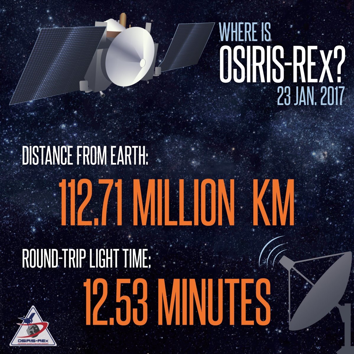 Diciotto ore e mezza dopo il lancio, OSIRIS-REx ha oltrepassato l’orbita lunare, mentre ora si trova a 3,2 milioni di km da noi in allontanamento alla velocità di 5,5 km/s.
