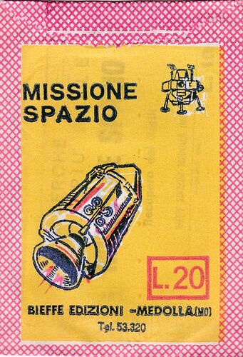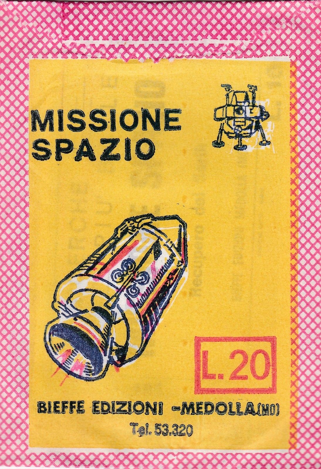 Ottobre 1969: davanti a tutte le scuole italiane viene distribuito ad ogni alunno questo album “MISSIONE SPAZIO” da completare con le apposite figurine da acquistare in edicola. E’ un bel album, almeno per l’epoca, e direi l’unico che abbia mai trattato sul tema l’esplorazione dello spazio, anche sull’onda della recente, (allora), conquista della Luna.