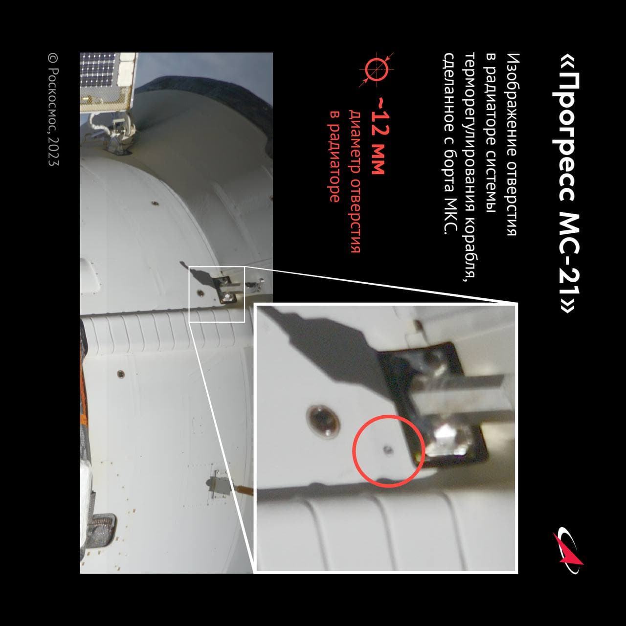 Secondo i dati preliminari di RSC Energia, il Progress MS-21, come prima il Soyuz MS-22, era esposto a influenze esterne. Tali conclusioni sono tratte sulla base di fotografie che mostrano i cambiamenti sulla superficie esterna della nave, incluso il radiatore del compartimento strumentale e dei pannelli solari.