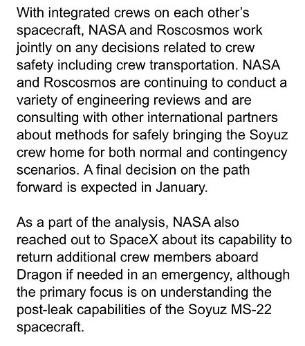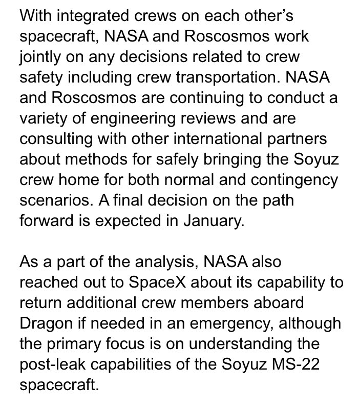 Qualsiasi altra decisione sulla Sojuz MS-22 e il relativo effetto cascata sulla Sojuz MS-23 e la pianificazione delle missioni future è rimandato tra qualche settimana, a gennaio 2023. Le condizioni della capsula hanno (o potrebbero avere) un impatto sui voli incrociati tra Russia (Sojuz) e Stati Uniti (Crew Dragon). In sintesi NASA e Roskosmos stanno valutando le posizioni di Anna Kikina, Francisco Rubio, Andrej Fedjaev e Loral O’Hora sulle rispettive capsule ed equipaggi.