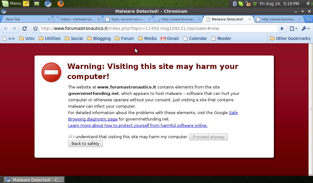Io uso sia Firefox che Chrome con XP e con Ubuntu e con entrambi i pc mi fa una cosa strana: svuoto la cache e sembra tutto ok, effettuo il login e nuovamente mi riappare la schermata del presunto malware… Strano, no?