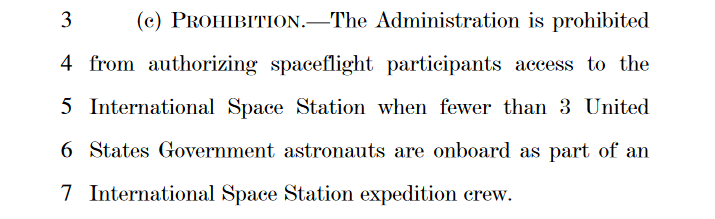 Non ne capisco molto di politica e legislazione in generale, chiedo il Vs aiuto nel decifrare questa proposta (?) che negherebbe l’accesso alla ISS ad astronauti di altre nazioni, nel caso in cui siano presenti meno di tre astronauti USA.