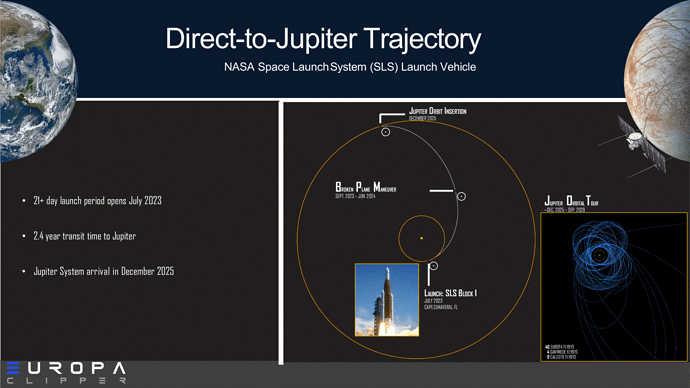 Per quanto riguarda Europa Lander la situazione è più incerta al momento in quanto ci sarà da vedere se la missione verrà completamente finanziata. L’unico vettore preso in considerazione per il lancio è SLS Block 1B. La traiettoria userebbe una sola fionda gravitazionale terrestre con un tempo di volo complessivo di circa 5 anni. Dal tardo 2025 al 2030. Vedremo nei prossimi anni come evolve la situazione. Data la massa e le dimensioni della sonda, la missione dipende prettamente da SLS.