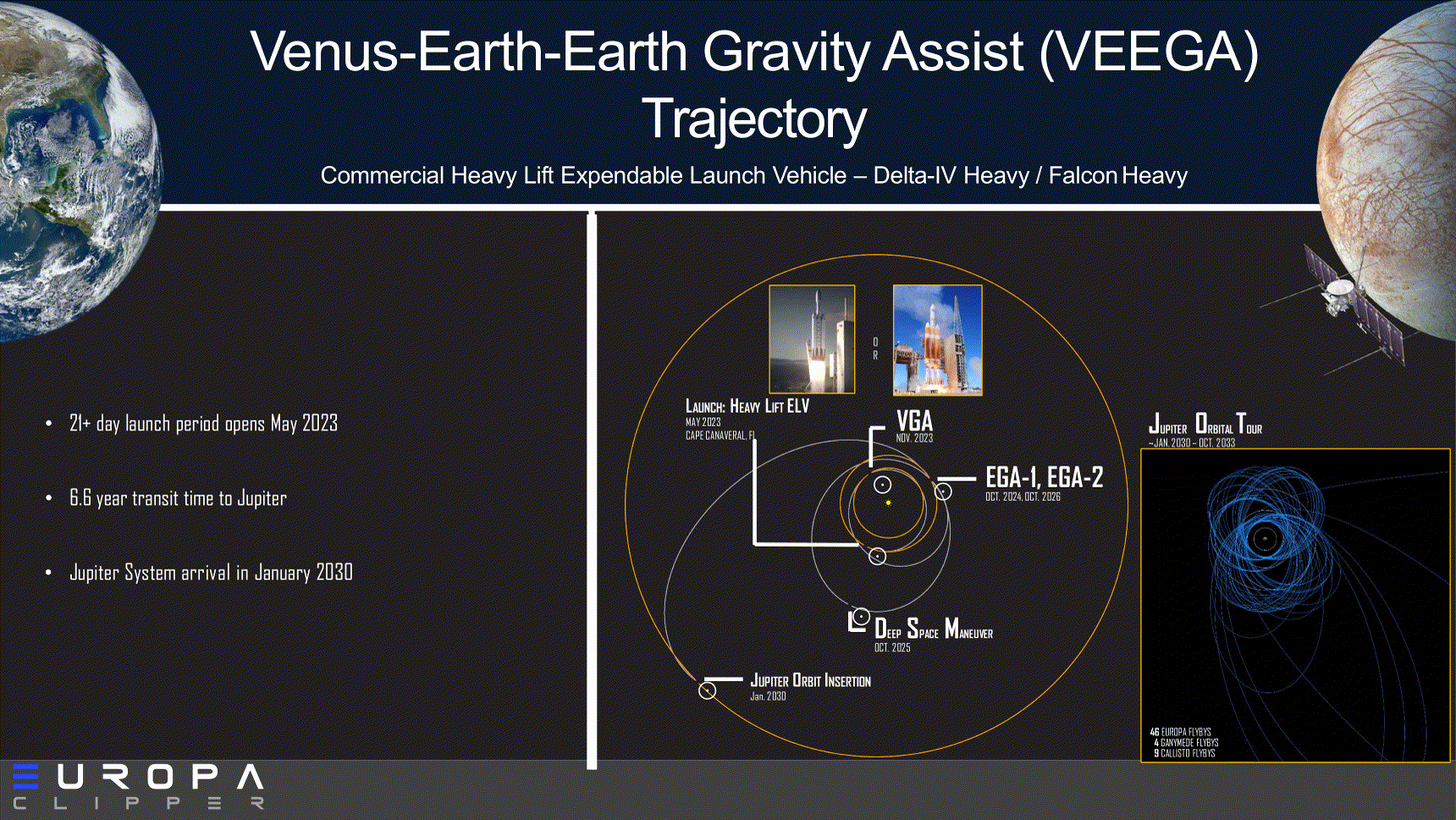 Come si può osservare SLS è più costoso sia del Delta 4 Heavy che del Falcon Heavy. Tuttavia straccia entrambi sulla tempistica. Le traiettorie proposte per la missione sono 3. Nelle immagini si può vedere come l’uso di Falcon Heavy (a perdere) e Delta 4 Heavy immette EC in una classica VEEGA (Venus Earth Earth Gravity Assist). Tempo di volo è di 6.6 anni. Il Falcon Heavy essendo più potente del D4H permette di portare la sonda in una traiettoria più veloce usando solo una fionda gravitazionale della Terra e l’utilizzo al lancio di uno stadio solido aggiuntivo. Lo Star48BV. Cosi si scende da 6.6 a 5.9 anni. Un risparmio di circa 8-9 mesi. La terza opzione, quella che per ora verrà usata, utilizza un SLS Block 1 Cargo. SLS è capace di mandare Europa Clipper direttamente verso Giove. Il tempo di volo viene tagliato di oltre la metà rispetto alla seconda soluzione più veloce. Dalla Terra a Giove in 2.4 anni. Si tratta certamente di un vantaggio. Un vantaggio che però ha un costo come si può notare dalla slide dell’OIG.