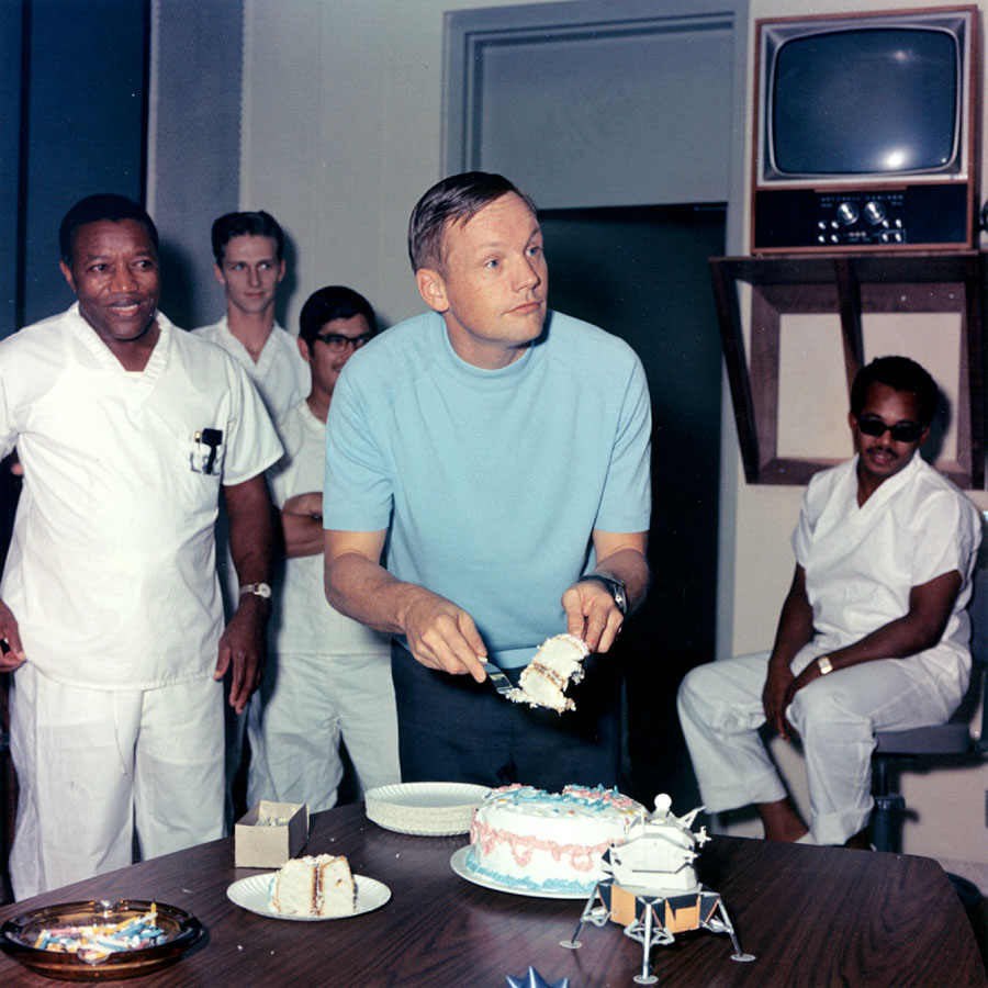 1969/08/05. Missione Apollo 11. Il comandante del primo viaggio spaziale con fermata sulla Luna, Neil Armstrong, festeggia il suo 39esimo compleanno all’interno del Lunar Receiving Laboratory. (S69-40958 scansione Ed Hengeveld)