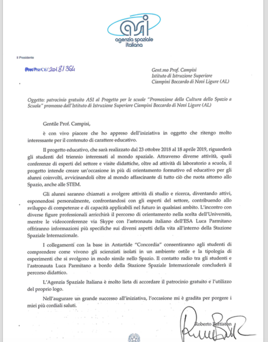 Vi posto le ultime news del Progetto “Spazio alla Conoscenza”, mi è arrivato l’ok per Base Concordia il 17 gennaio e oggi il patrocinio con possibilità di uso del logo da parte di ASI.