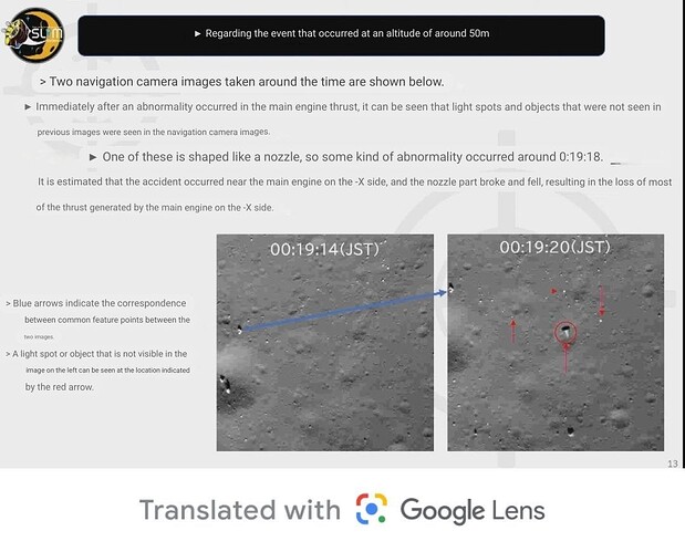 Una delle slide piu’ impressionanti mostra che uno de due ugelli del motore principale si e’ staccato durante la discesa. Fortunatamente il sw di bordo ha compensato anche per questo imprevisto.