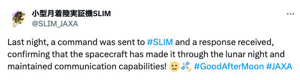 Last night, a command was sent to SLIM] and a response received, confirming that the spacecraft has made it through the lunar night and maintained communication capabilities! Communication with SLIM was terminated after a short time, as it was still lunar midday and the temperature of the communication equipment was very high. Preparations are being made to resume operations when instrument temperatures have sufficiently cooled.