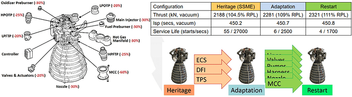 Il motore RS-25E entrerà in servizio sul quinto volo di SLS. Il motore RS-25E verrà utilizzato al 111% RPL (Rated Power Level) contro l’attuale 109%. L’incremento in spinta aiuterà il vettore a portare maggior massa in LEO e oltre. L’RS-25E sarà certificato per la fine del 2021 e nel 2024 la AJR consegnerà i primi 6 motori alla NASA. Si parla di 2321 kN nel vuoto (Spinta totale 9284 kN) e 1893 kN al lancio (spinta totale core 7572 kN). Oltre alla performance il motore RS-25E mira ad abbattere fortemente i costi e i tempi di produzione.