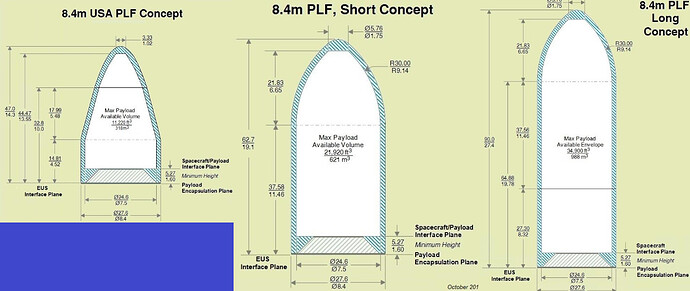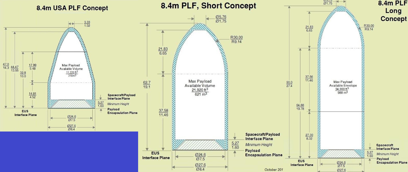 In versione full cargo abbiamo un fairing derivato dall USA che utilizza una copertura (8.4 metri X 14 metri). Questa soluzione molto leggera, anche se relativamente poco voluminosa, offre comunque 318 m3 di volume. Anche cosi si è ben oltre il fairing del Delta 4 Heavy e anche il fairing previsto per il Vulcan. Come step successivi ci sono lo short e long fairing da 8.4 metri. Rispettivamente sono alti 19.1 e 27.4 metri, per un volume offerto di 621 m3 e 988 m3.