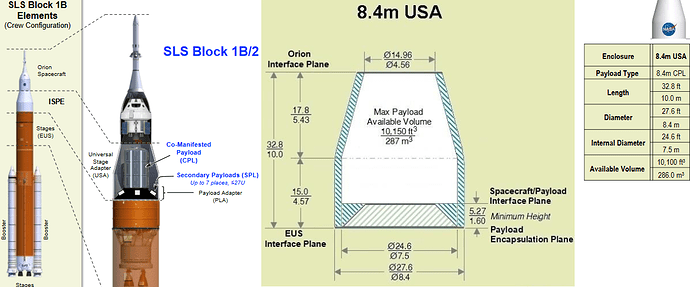 Lo stadio supporta 5 diverse opzioni per il fairing. Le configurazioni dipendono a seconda della missione. SLS B1B può essere utilizzato in modalità full cargo, oppure lancio di Orion con cargo aggiuntivo. Per quanto riguarda la modalità con crew, SLS B1B si avvale di un adattore (Universal Stage Adapter o USA) che converte il diametro di EUS (8.4 metri) nel diametro dello stack Orion (5.4 Metri). Il volume disponibile è di 283 m3. Come per ICPS ci sono slot per Cubesats.