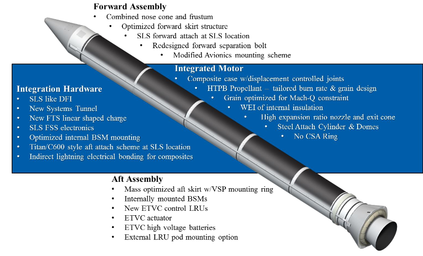 L’ultimo step che completa SLS Block 1B+ è il nuovo è il certamente molto interessante programma BOLE. BOLE sta per Booster Obsolescence and Life Extension. Come detto mesi orsono (novembre) NGIS era in “combutta” sottobanco con NASA a riguardo una collaborazione tra OmegA e SLS lato SRB. Ora è diventato qualcosa di ben più concreto e ufficiale. Il programma BOLE mira a sostituire e migliorare gli SRB di SLS. Il prescelto è il CASTOR 1200 o una versione leggermente modificata. BOLE non solo migliora la performance ma anche la sicurezza (CASTOR non usa gli O-Rings). Lato numeri, CASTOR è oltre 30% più leggero rispetto al segmento STS, 40% meno costoso, usa carburante con maggiore ISP e fornisce spinta superiore. Un CASTOR 1200 per SLS produrrebbe oltre 19000 kN di spinta (45772 kN di spinta complessiva al decollo).