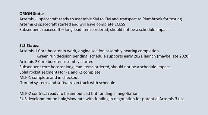 Quest’anno circa 200 mln USD sono stati dedicati a EUS e ML-2. Tuttavia a seguito della proposta budget 2020, erano sorti dubbi sul destino di questo necessario upgrade. In un seguito di annunci ecclatanti su altri annunci, e la dichiarazione di Luna 2024, l’amministratore NASA ha nuovamente fatto presente la necessità di EUS e del B1B per portare a termine il compito. Il 15 Aprile verrà comunicato un nuovo budget, nel quale con ogni probabilità ci sarà un ritorno dei fondi per EUS in ottica 2020 (il tutto poi dovrà passare dal congresso ovviamente). Ulteriori update seguiranno nei prossimi giorni.