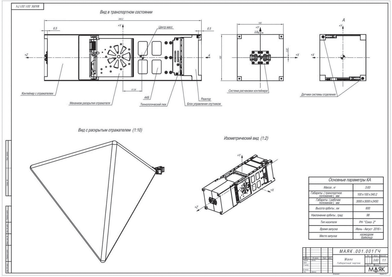 маяк, in russo significa “beacon”, “faro”. Se tutto andrà secondo i piani il cubesat, una volta in orbita, rilascerà una “vela” a forma di tetraedro con lati di 4m[sup]2[/sup] che servirà per dimostrare una tecnica di deorbiting. La vela, però, è realizzata in un materiale metallico fortemente riflettente, con lo scopo di rendere visibile il satellite ad occhio nudo. In teoria, dovrebbe apparire in cielo come un oggetto di magnitudine -10 (!)