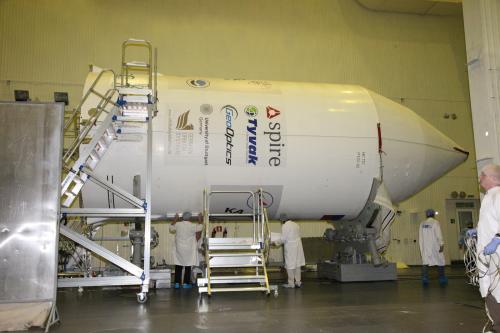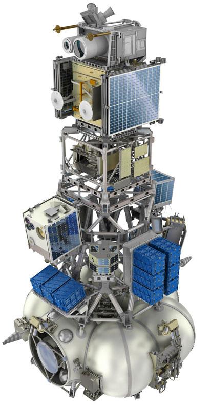 Ecco un rendering di come saranno alloggiati tutte e 77 73 sotto il fairing (Kanopus è quello in cima, quella cosa rotondeggiante alla base è l’upper stage Fregat):