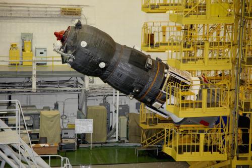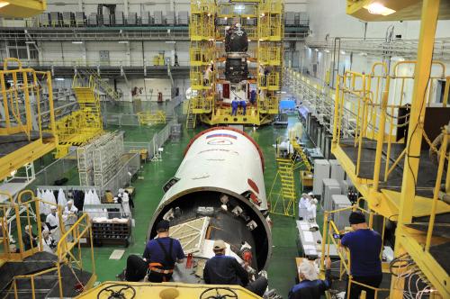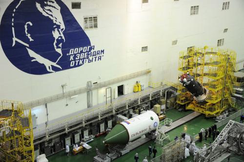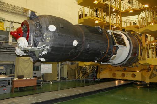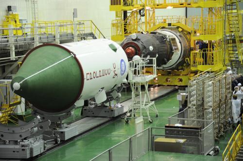 Integrazione del lanciatore. Notare che le operazioni, come già visibile anche nelle foto postate da Lupin, si svolgono all’interno del sito 112 (molto luminoso con ampie finestre), dove solitamente si montano i razzi Soyuz destinati ad essere lanciati dal pad 1.