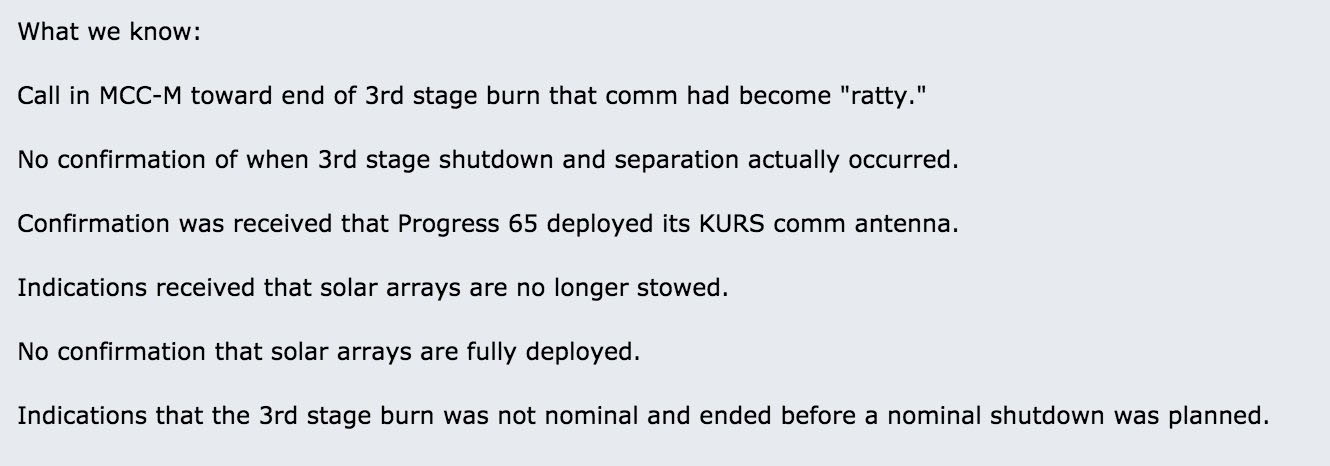 Fino ad oggi immaginavo ingenuamente che le animazioni che vengono mostrate durante i lanci, quando mancano le immagini reali, fossero in qualche modo legate alle telemetrie. In realtà quella del volo di Progress MS-04 mostrata oggi è continuata tranquillamente anche dopo i 383 secondi, mostrando la separazione del cargo dal terzo stadio nel momento prefissato (529 secondi), quando invece i tecnici non sapevano più che cosa stesse accadendo…