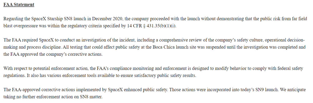 Se SpaceX, come pare di caprie, avesse violato i termini della licenza di lancio per SN8, e FAA non avesse reagito con le giuste sanzioni e tempestività, l’ente regolatore statunitense ne uscirebbe indebolito a livello istituzionale.