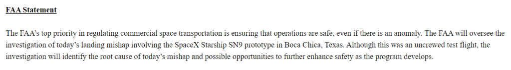 Mentre per SpaceX questa fase di sviluppo prevede tanti bei possibili botti senza troppi connotati negativi, per FAA, a causa della sua stessa natura, ogni esplosione e’ un sintomo di qualcosa che non va, che non dovrebbe succedere a un oggetto che vola, e che andrebbe sistmato.