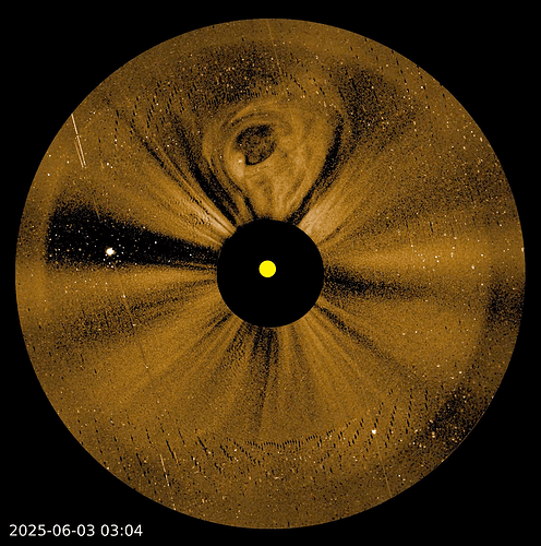 The Narrow Field Imager (NFI) camera, mounted on one of the four spacecraft of NASA’s PUNCH mission, imaged a large coronal mass ejection (CME) in exquisite detail on June 3, 2025. The CME can be seen rising in the center of the image, above the blocked-out Sun. This preliminary image includes artifacts of early processing but reveals NFI’s ability to image the Sun’s outer corona in great detail, in conjunction with the rest of PUNCH. NASA/SwRI