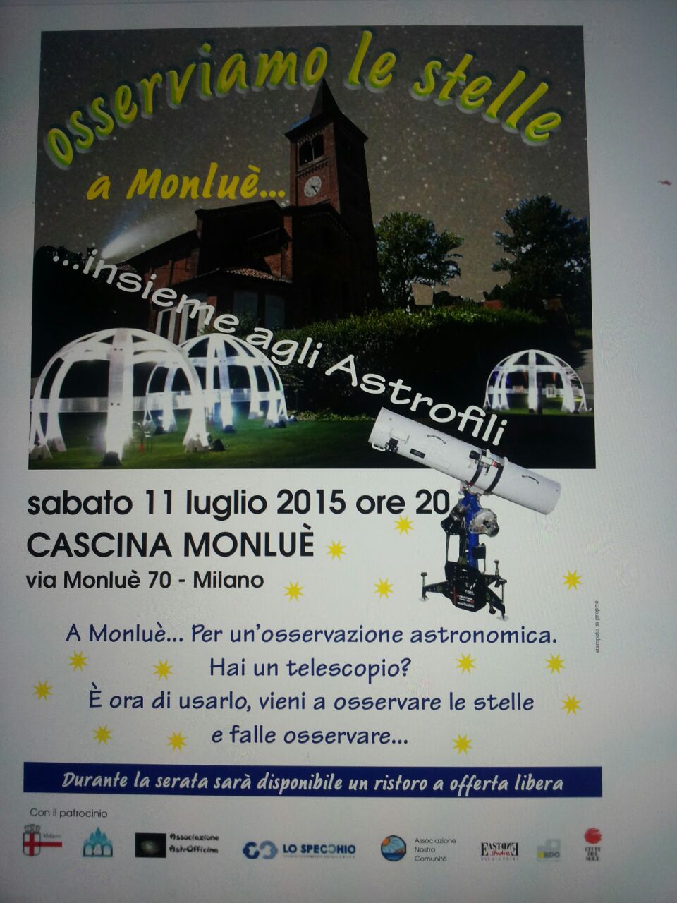 Sabato 11 luglio 2015 dalle ore 20:00 si svolgerà presso la Cascina Monluè di Milano la manifestazione astronomica “Osserviamo le stelle a Monluè…”, in pratica uno star party in cui si potrà osservare il cielo con i telescopi. Allego la locandina dell’evento.