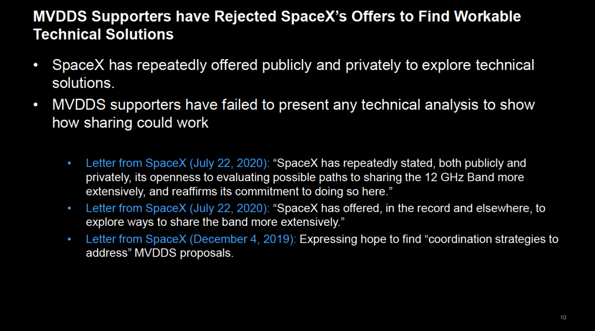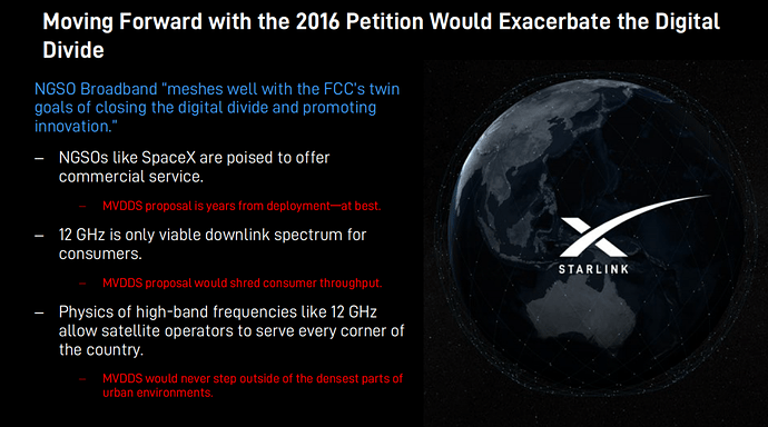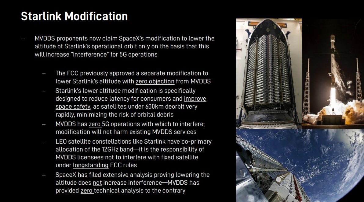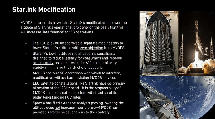 SpaceX ha presentato analisi approfondite provando che l’abbassamento dell’orbita non aumenta il rischio di interferenze. Gli MVDDS non hanno portato alcuna analisi tecnica per provare il contrario.
