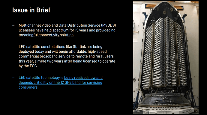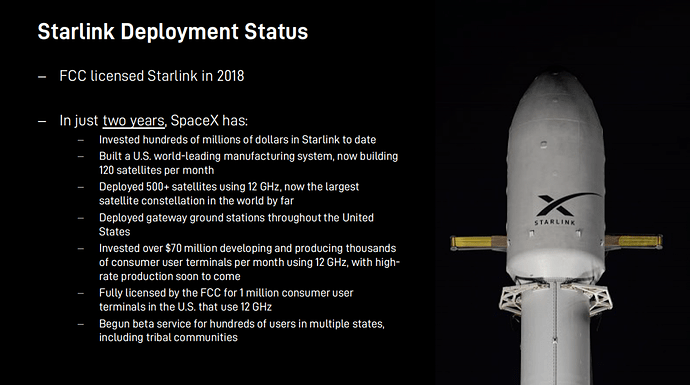 Lascio in allegato la lettera che un rappresentante di SpaceX ha scritto alla FCC relativamente alla questione poi presentata nella presentazione (in parole povere e semplici, alcuni operatori vogliono dedicare 500 MHz dello spettro a 12 GHz per il 5G, quando SpaceX lo vuole usare per Starlink).