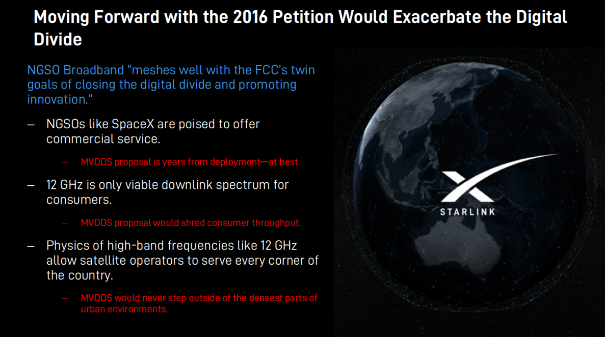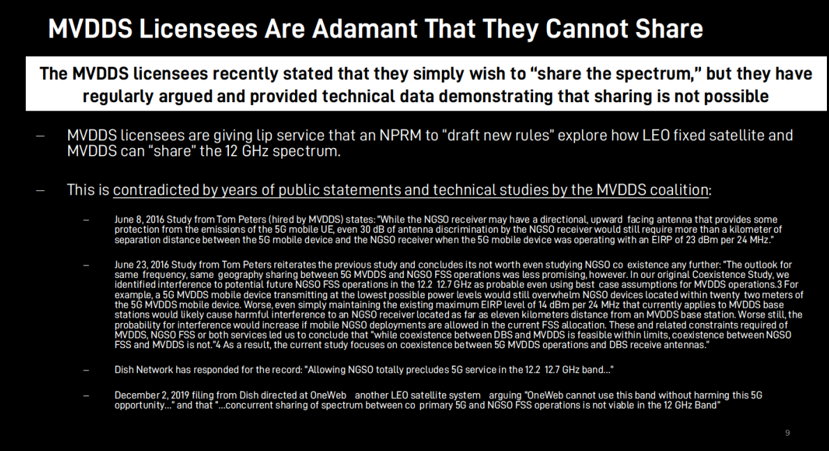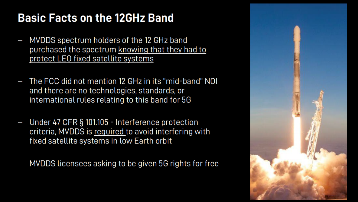 Le costellazioni LEO come Starlink hanno collocamenti di pari importanza nella banda 12GHz ed è responsabilità delle licenze MVDDS di non interferire con i satelliti in orbita bassa, in accordo con le norme di lungo corso della FCC;