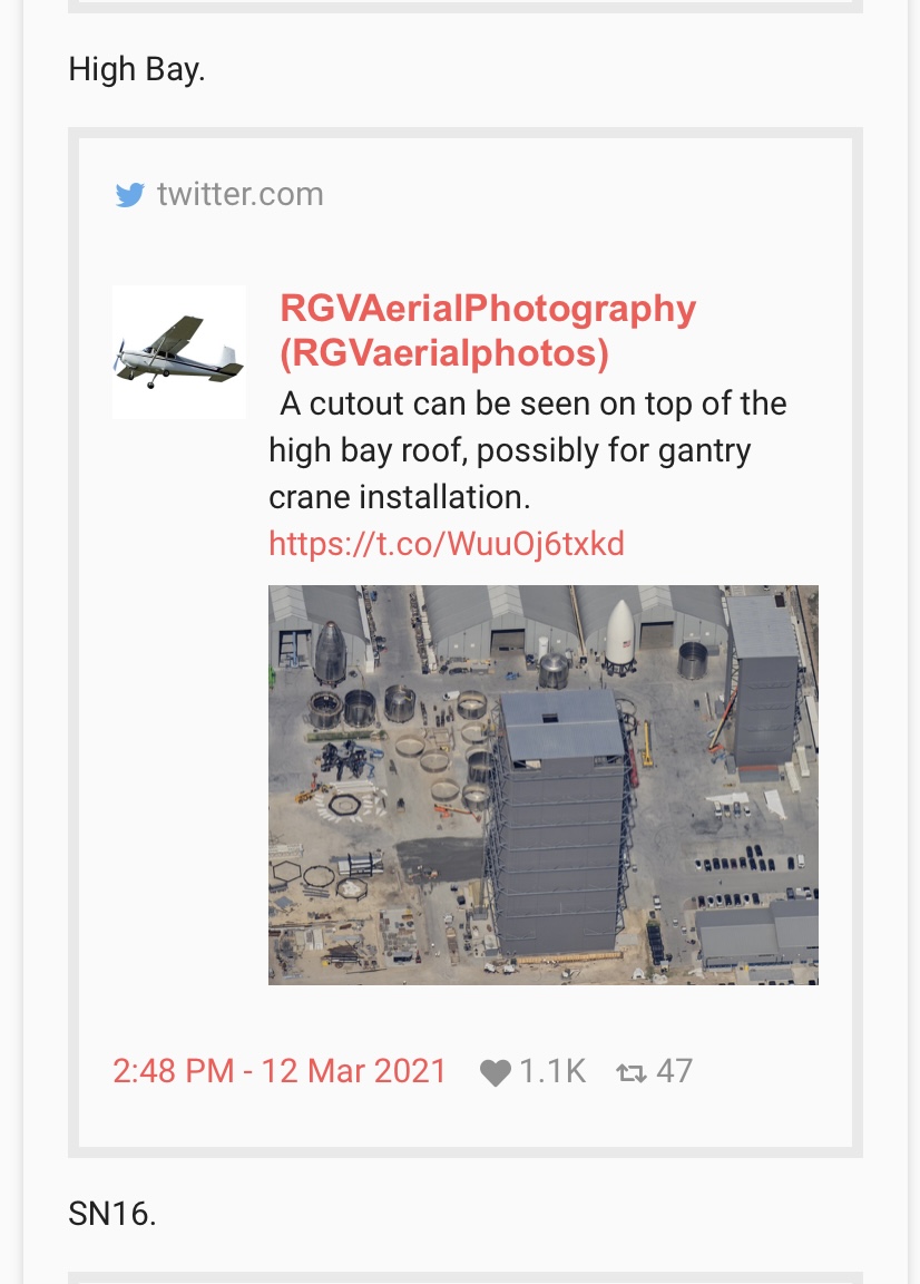 Domanda, tempo fa Elon aveva parlato di una gru a ponte all’interno dell’High Bay per facilitare le operazioni di stacking. Ma non mi risulta che sia ancora stata installata. Si hanno novità in proposito?