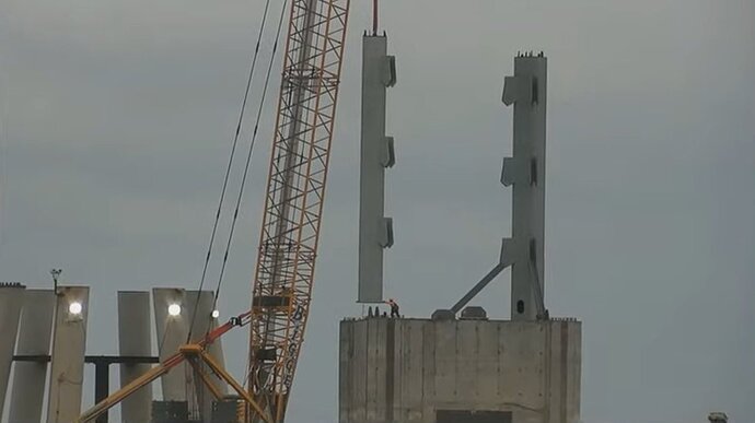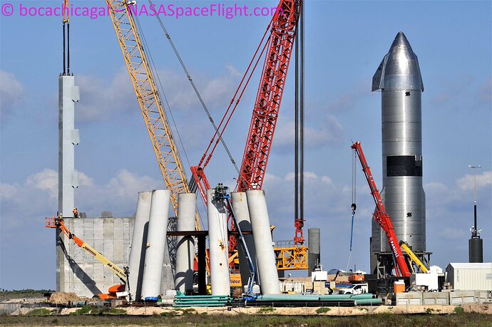 Sopra il basamento in cemento armato si inizia ad erigere la torre di servizio al pad orbitale.