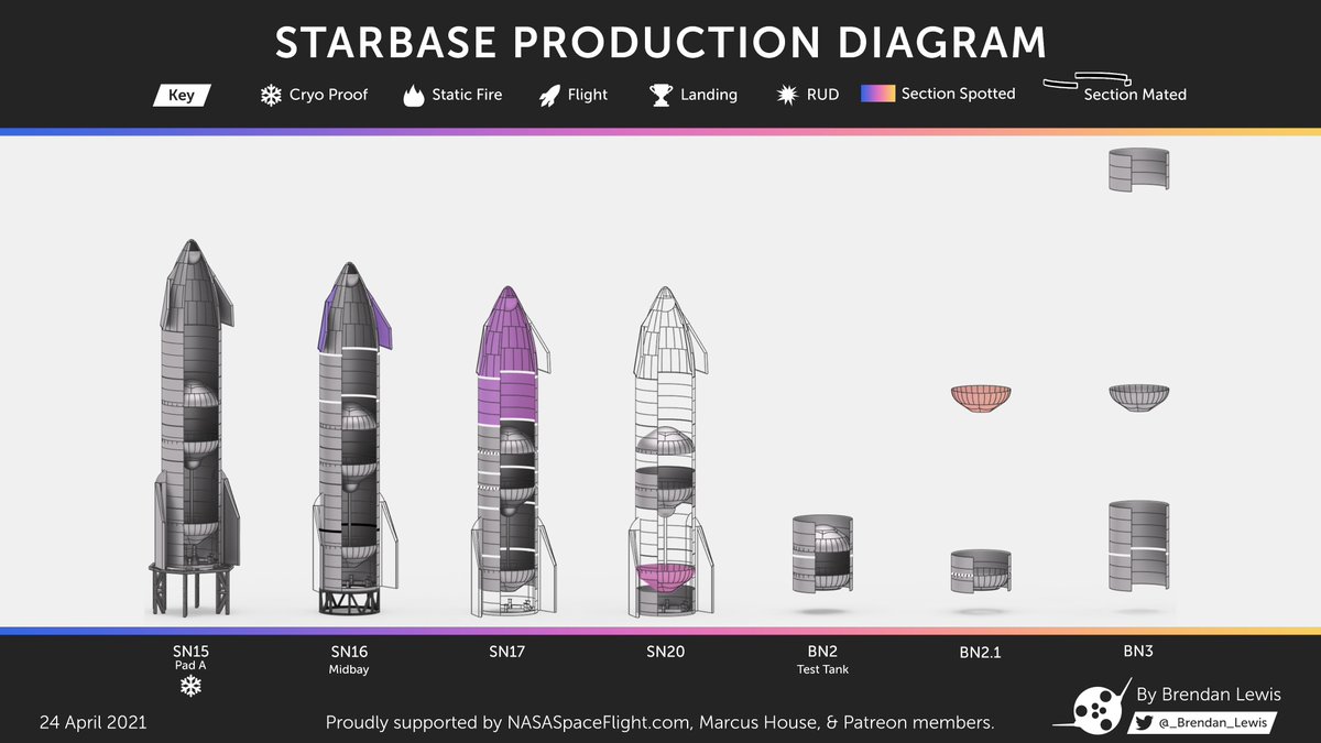 Status dei prototipi al April 24, 2021 5:40 AM. Le sezioni in blu e rosso sono parti nuove individuate rispetto al diagramma della settimana precedente, mentre le bande più sottili indicano l’unione di due componenti.