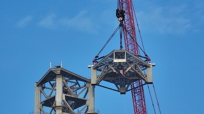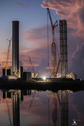 mhmm… ok, però l’assemblaggio SS+SH lo fanno con una gru a parte quindi? o il meccanismo a braccio, oltre che “abbracciare” solleverà anche SS? e anche se fosse, chi mette sul pad SH? dovrebbero essere due sistemi a braccia come quelli del render e in più dovrebbero ruotare attorno alla torre in modo che si porti li con un trasportatore SS, il braccio la aggancia, la solleva e ruota sopra al pad; un altro trasportatore porta SH, il secondo sistema a braccio lo abbraccia, solleva e porta sul pad per posizionarlo. il primo sistema quindi cala SS su SH.