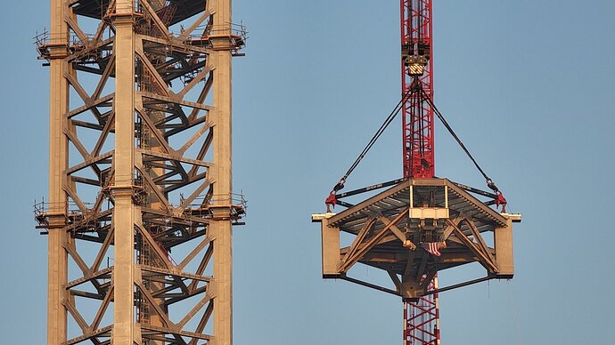 La nona sezione è sollevata. Pare sia iniziato il suo viaggio verso la cima della torre.