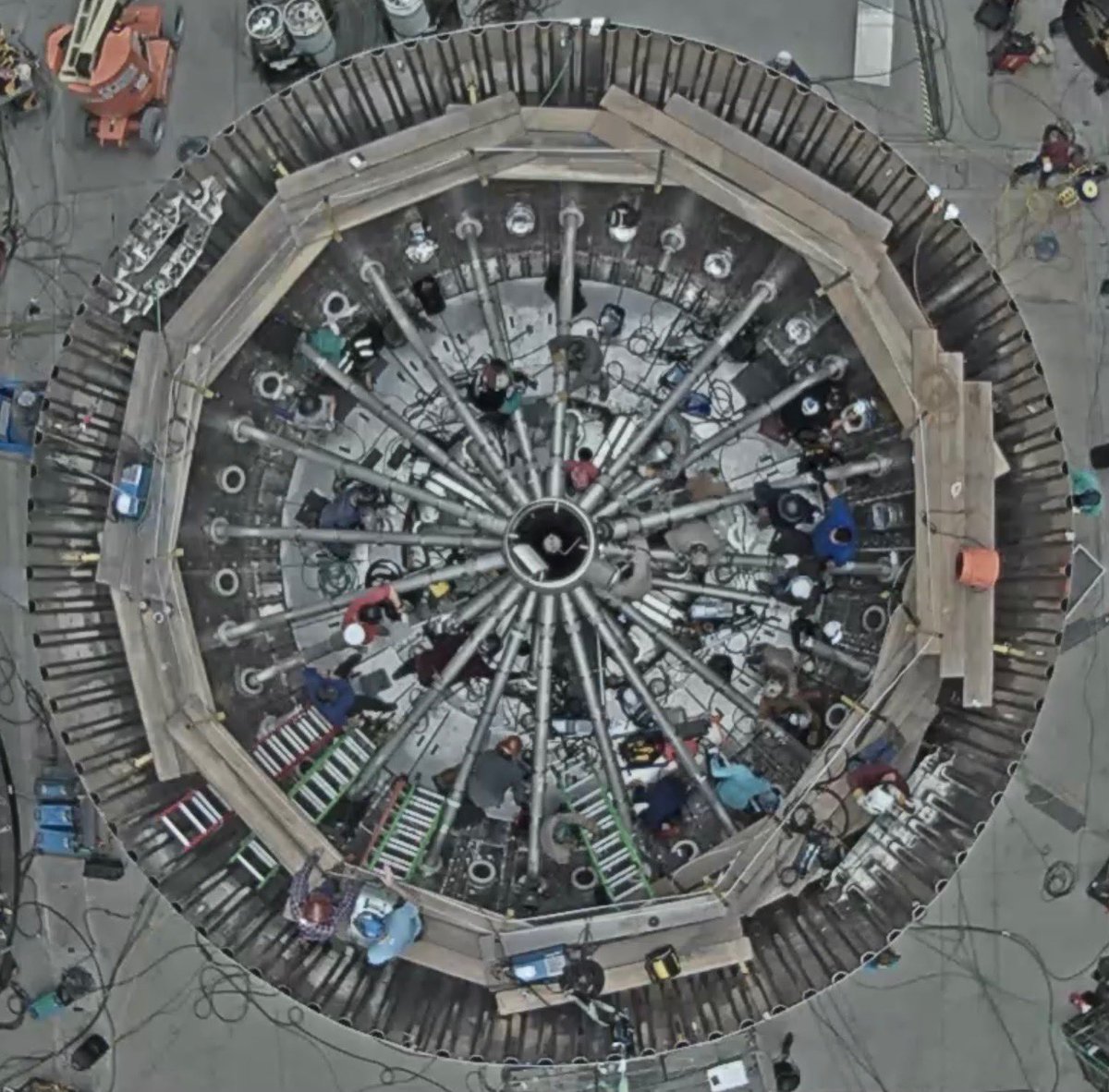 In pratica è la vista dall’alto dell’aft dome di Booster4, prima del flip.
