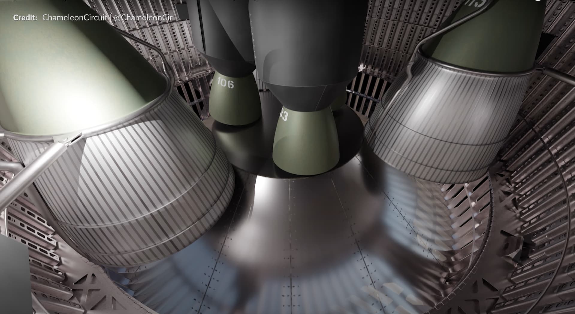questo estratto del video di MarcusHouse propone un render che fa ben capire la vicinanza dei motori alla dome dell’hot staging ring